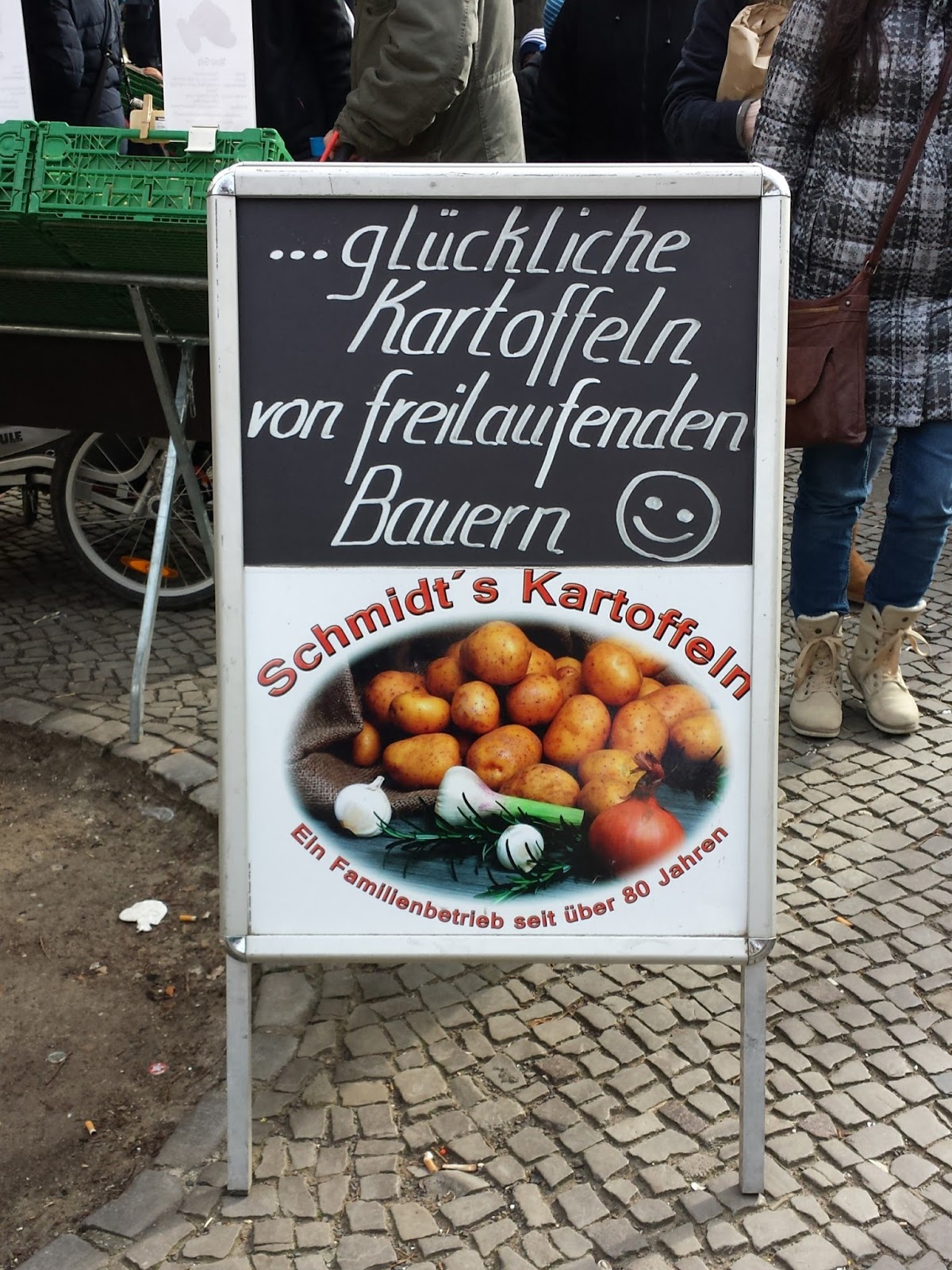 Nach dem Frühstück machen das Tochterkind und ich uns auf zum Wochenmarkt. Nur wir – und Puppe Bara darf auch mit.
