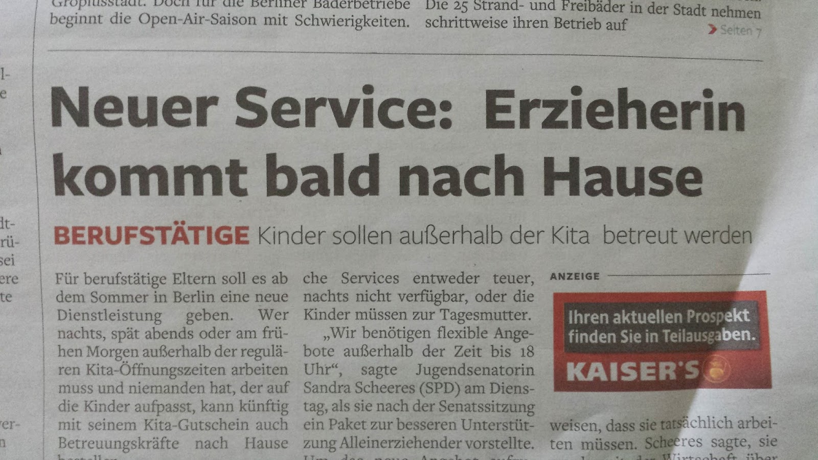 In der „Berliner Morgenpost“ lass ich an diesem Wochenende, dass besonders für Alleinerziehende via Kitagutschein eine Betreuung ihrer Kinder auch außerhalb der regulären Öffnungszeiten ermöglicht werden soll. Ich bin gespannt, wie sich das in der Praxis gestalten soll. Machen die Erzieherinnen dann „Hausbesuche“, übernachten bei den Kindern Zuhause oder holen sie ab? Eine flexiblere Nutzung der Gutschein-Stunden finde ich grundsätzlich richtig. Eins zu Eins – Betreuung ist im System jedoch nicht vorgesehen. Viele Kinder und wenig Erzieher ist doch die Realität. Gibt es dann kollektive Zusammenschlüsse von Eltern im Schichtdienst? Mal abgesehen davon, dass ich eigene Kinder habe, verdiene ich definitiv nicht genug Geld für Experimente. In der Regel wird „Mehrarbeit“ wie beim Elternabend schon nicht bezahlt, sondern mit Freizeit ausgeglichen, das wird sich hierbei auch nicht anders gestalten. Außerdem frage ich mich: Wie sehr möchte ich in die Privatsphäre der Familien eindringen? Und umgekehrt genauso?