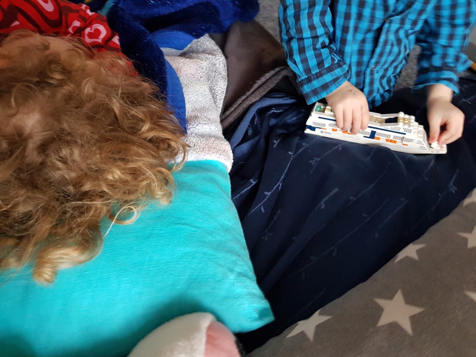 Am ersten Weihnachtstag lag Krümelie wieder auf dem Sofa. Krümel spielte neben ihr mit den Geschenken. Habt ihr das früher auch gemacht: Im Schlafi am Morgen des 25. Dezember die Geschenke bespielt? Das jedenfalls taten wir. Zusammen versuchten wir uns sogar an einem Gemeinschaftsspiel.