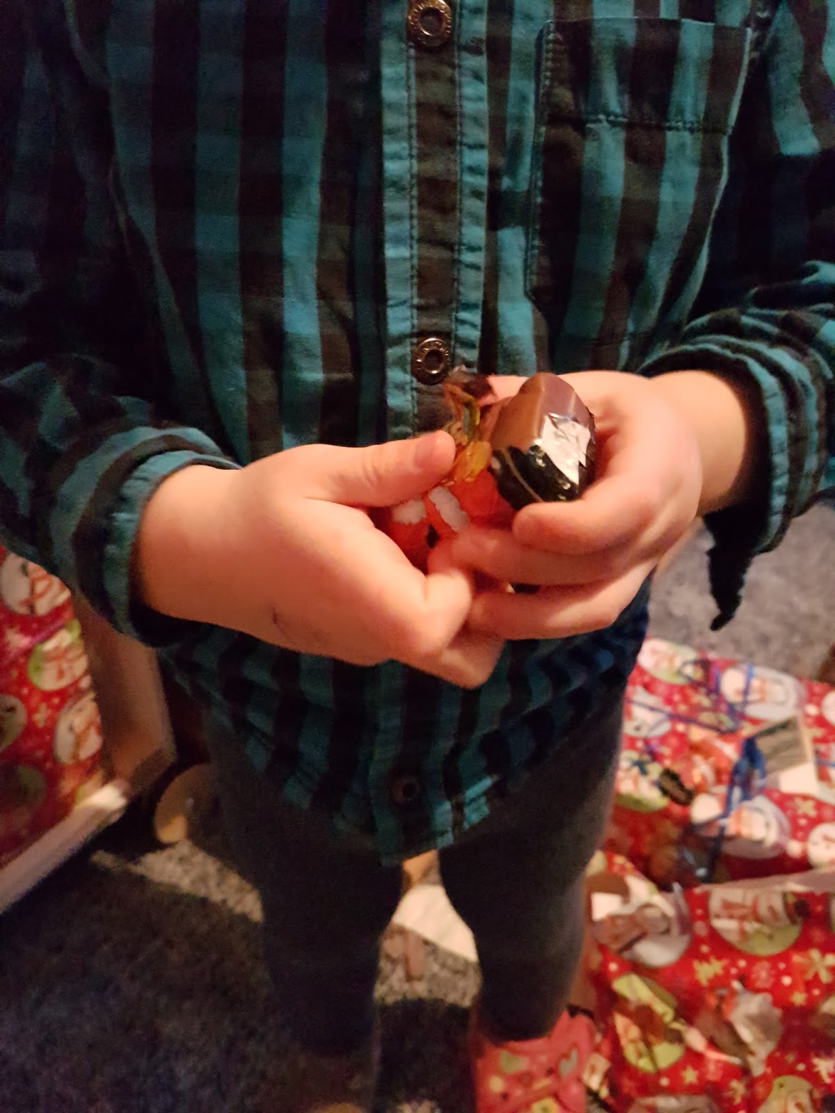 und dann wurden wir vom Herzmann abgeholt. Er hatte Essen vorbereitet und unser Geschenk für die Kinder zusammen gebaut. Dann hat er sich als Weihnachtsmann betätigt.