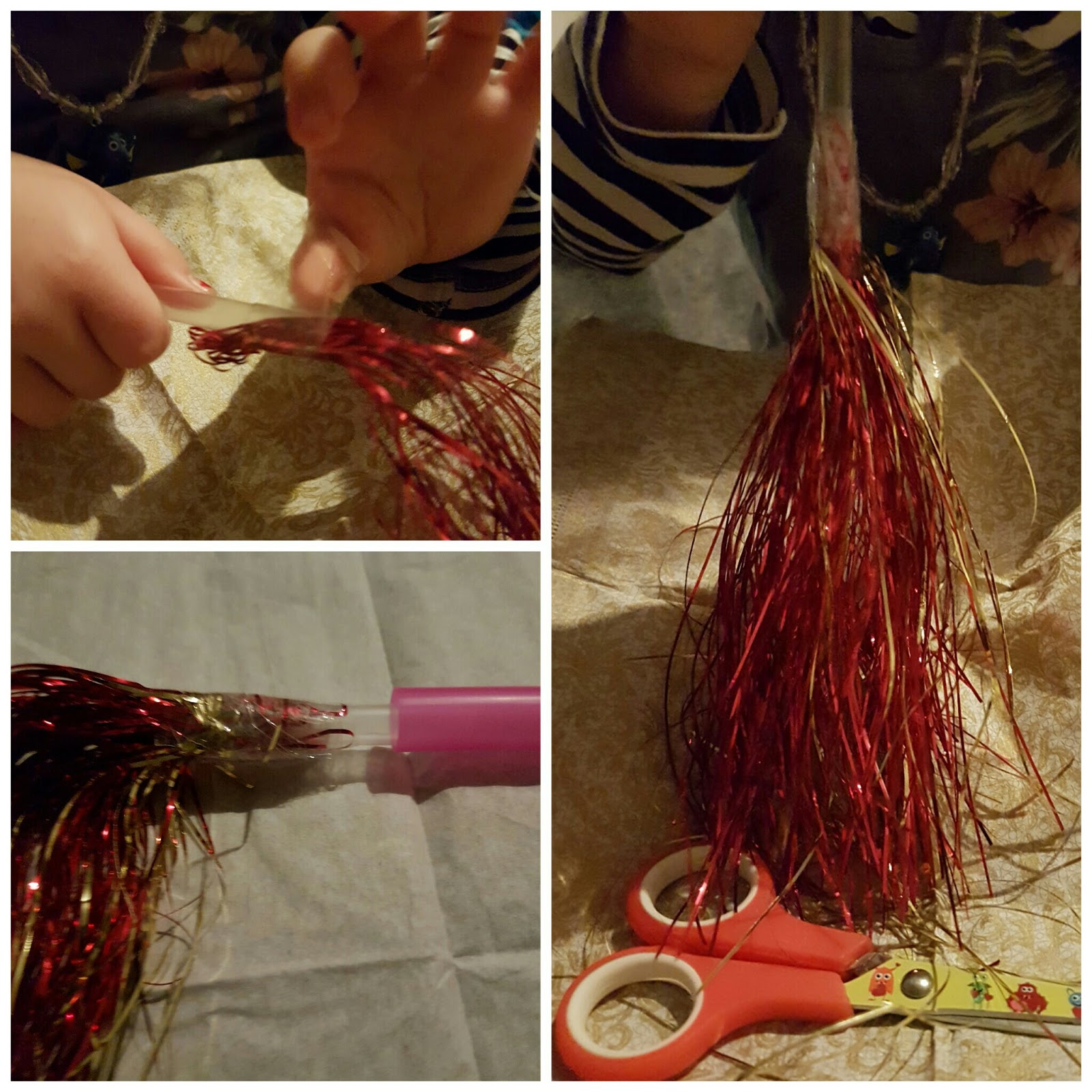 - Lametta, wahlweise Geschenkband oder etwas anderes flattriges, fädiges und leichtes
