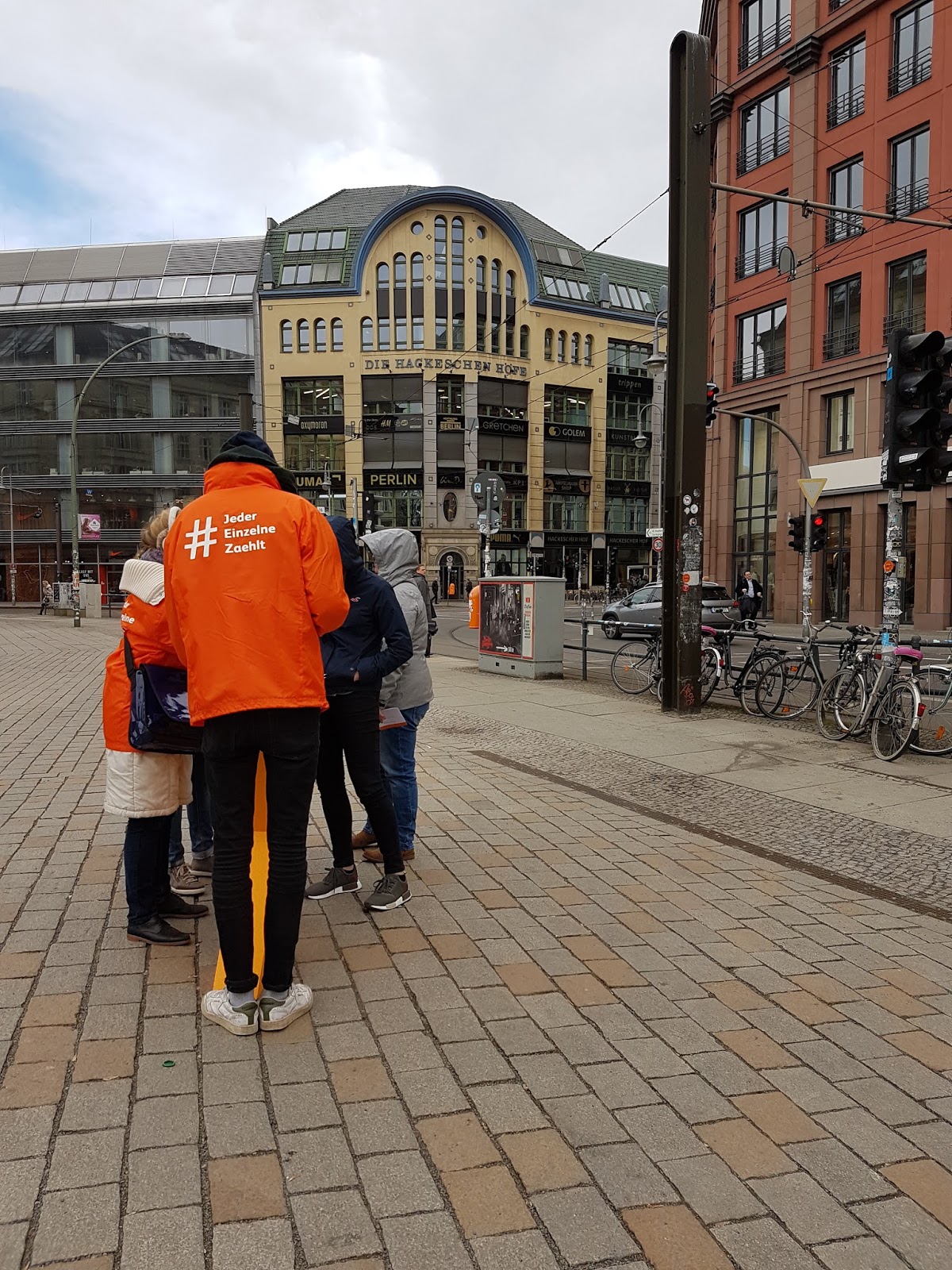 In ihren orangen Jacken und mit Handreichungen in ihren blauen Taschen fielen dem Herzmann und mir die Teams mit dem X am Alex, Brandenburger Tor und Hackeschen Markt gleich auf. Wir hatten uns vorgenommen auch Leute anzusprechen, aber das war gar nicht weiter nötig. Außer aus dem LK-Biokurs kannten die Akteure auf den Straßen das Ullrich-Turner-Syndrom gar nicht weiter und doch waren sie mit Eifer dabei, informierten und fotografierten die Passanten.
