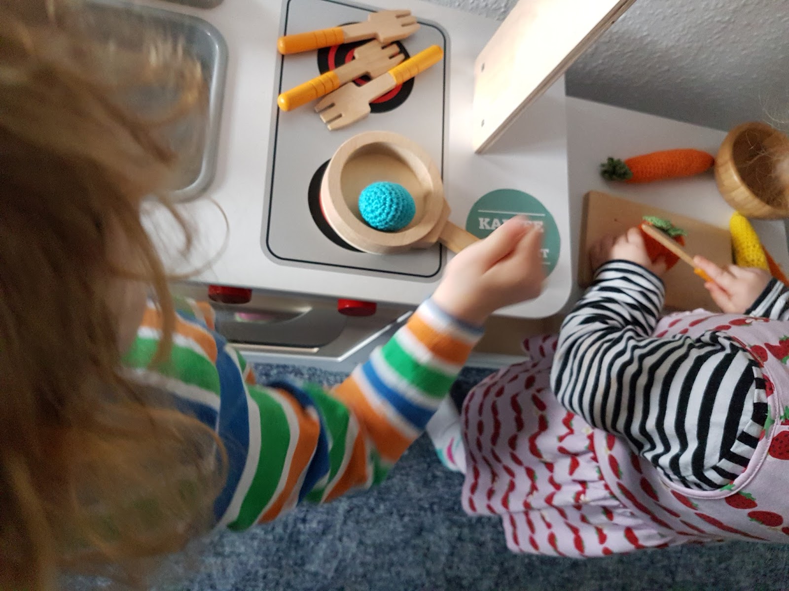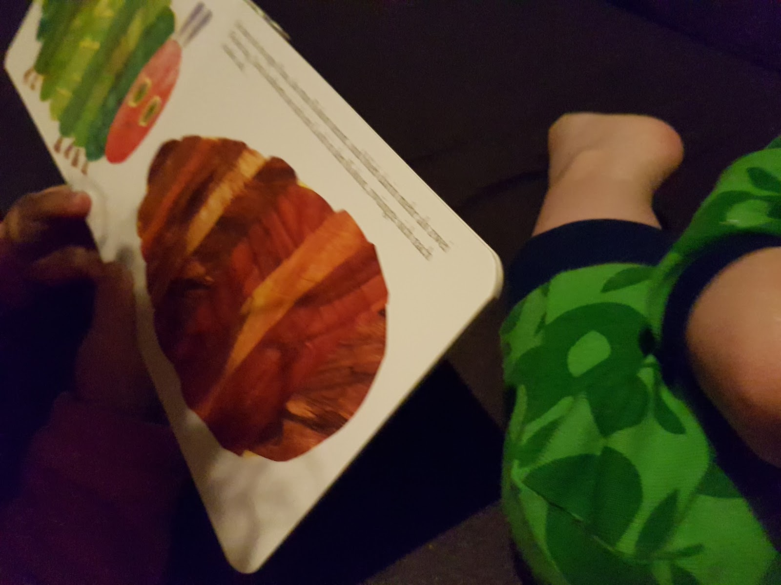 Nachdem am Tag von Geschwisterplüsch keine Spur zu spüren war, waren die Kinder am Abend besonders innig. Krümelie lass ihrem Bruder auf ihre Art die Geschichte von der „Nimmerraupesatt“ vor. Sie begann am Ende und ließ den Schmetterling berichten und berichtete aus seiner Perspektive. Großartig.