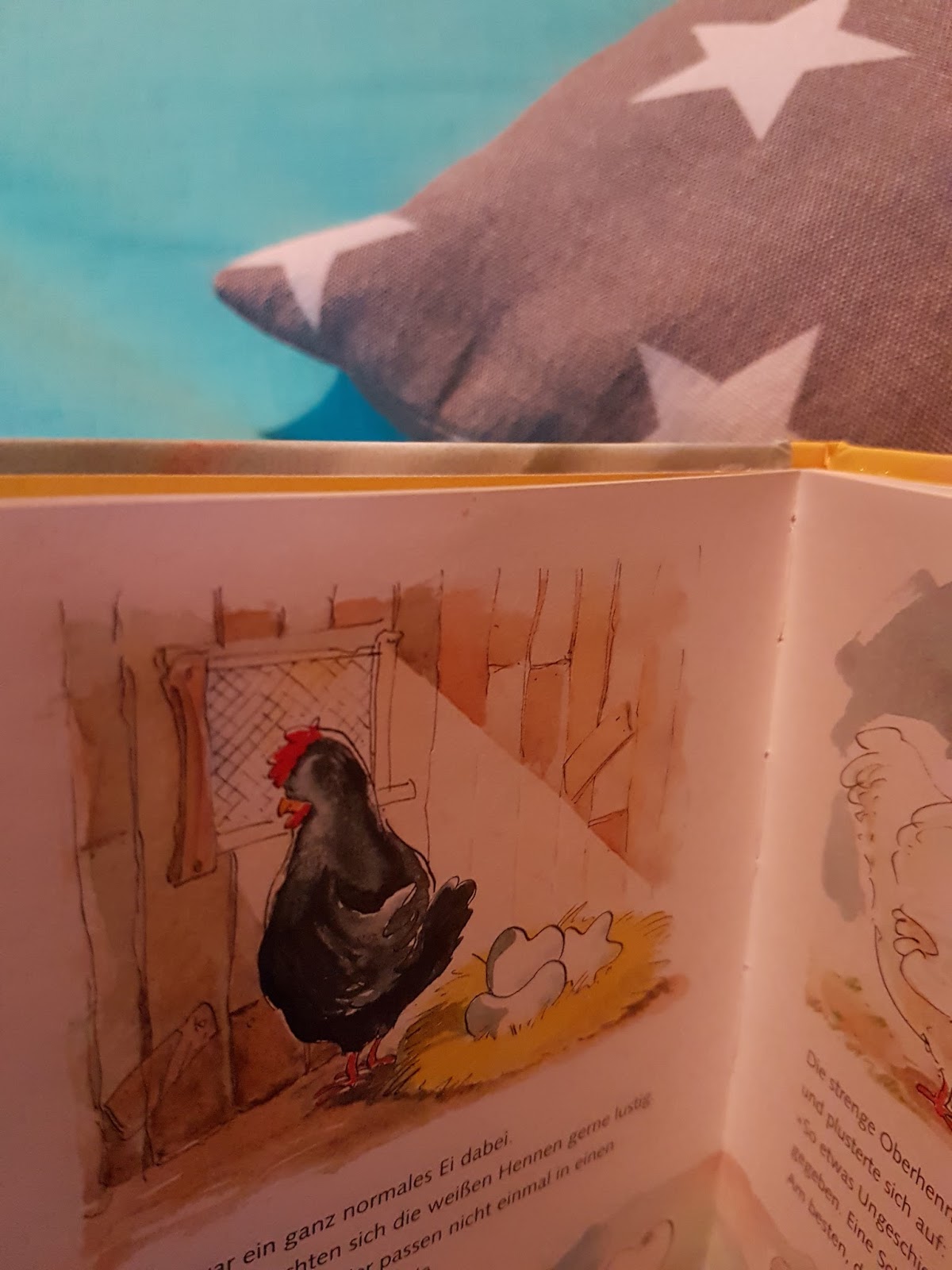 Ich dachte bei dem Titel: Da ist halt ein Huhn, was eine andere Gefiederfarbe hat und dadurch nicht in die Hühnerschar passt. Doch das schwarze Huhn ist das „schwarze Schaf“ auf dem Hof, weil es keine ovalen Eier legt.
