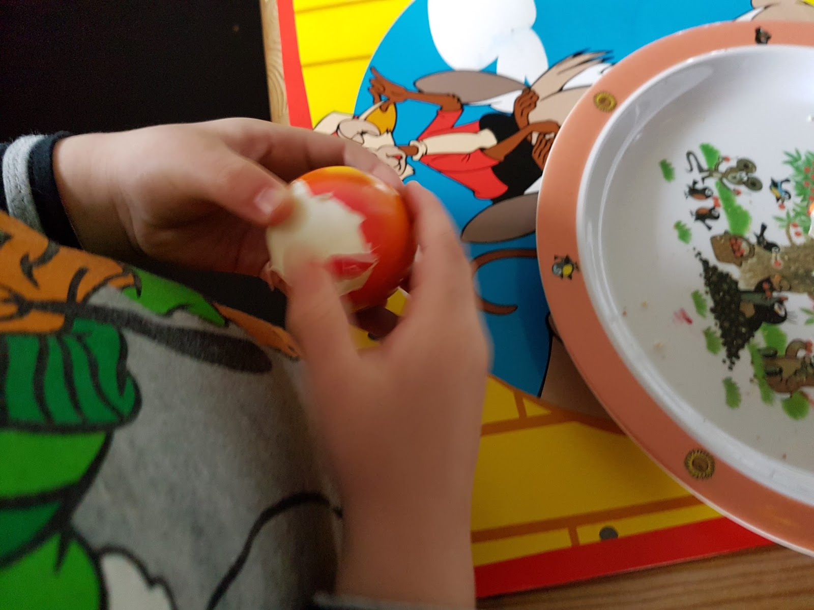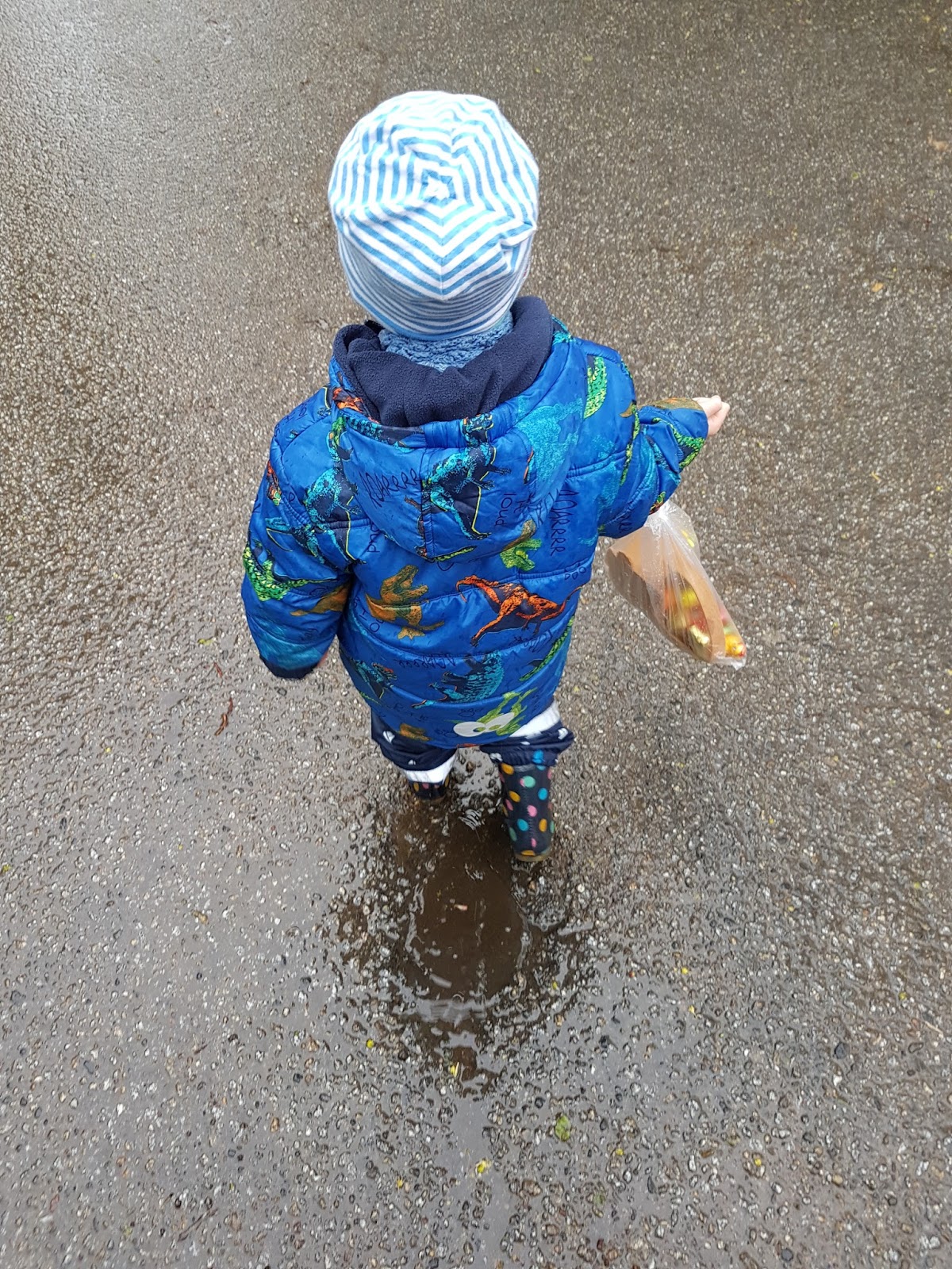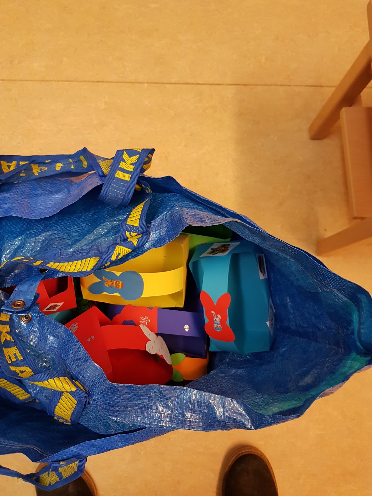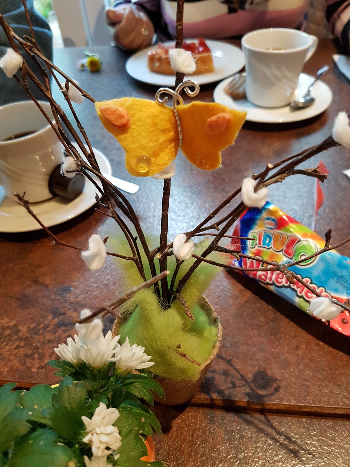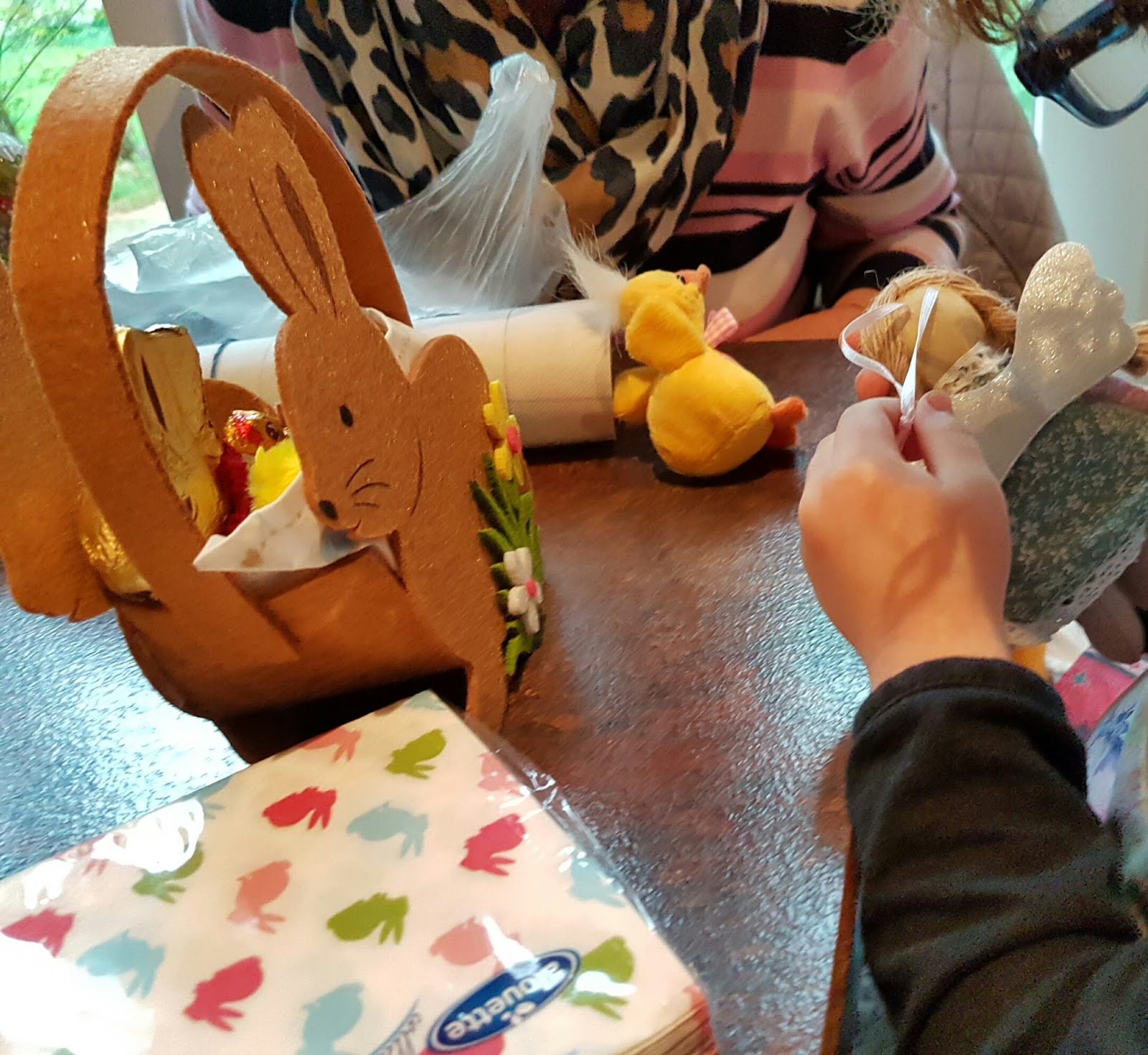 | Ergebnis der Osterkörbchenbastelaktion vom Vortag in der Gruppe des Sohnemanns abgeben |