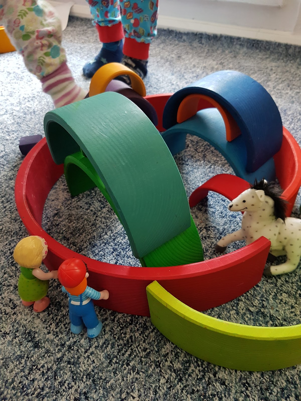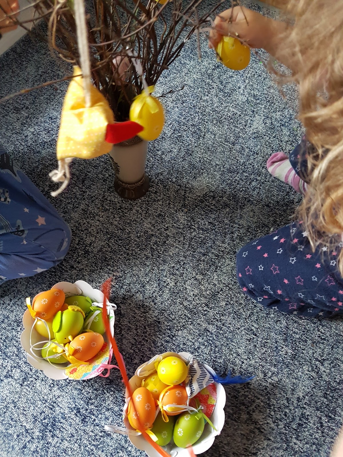 Im Anschluss wird gespielt und gearbeitet. Wir verabschieden uns von den Ostersachen. Die Kinder füllen nochmal ihre Nester und verstecken sich gegenseitig Spielzeug, was sie freudig wieder finden. Auch bei der Mission Wäsche und beim Kochen helfen Krümelie und Krümel. Wir klatschen uns gegenseitig in die Hände und essen.