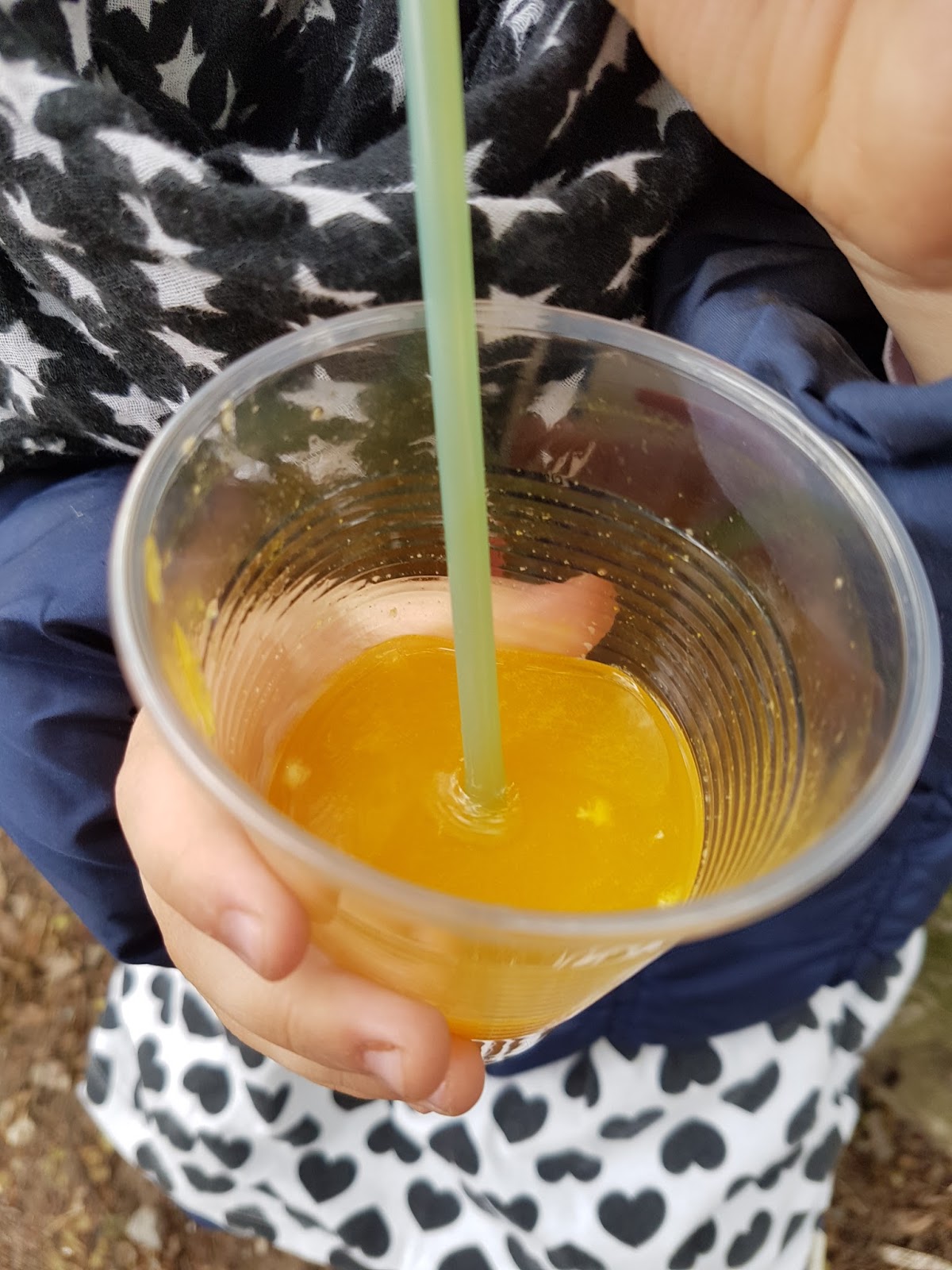 Für die Kinder gab’s Orangensaft und Krümelie freute sich über die Entdeckung, dass der blaue Strohhalm grün wurde, wenn der Saft durchfloss.