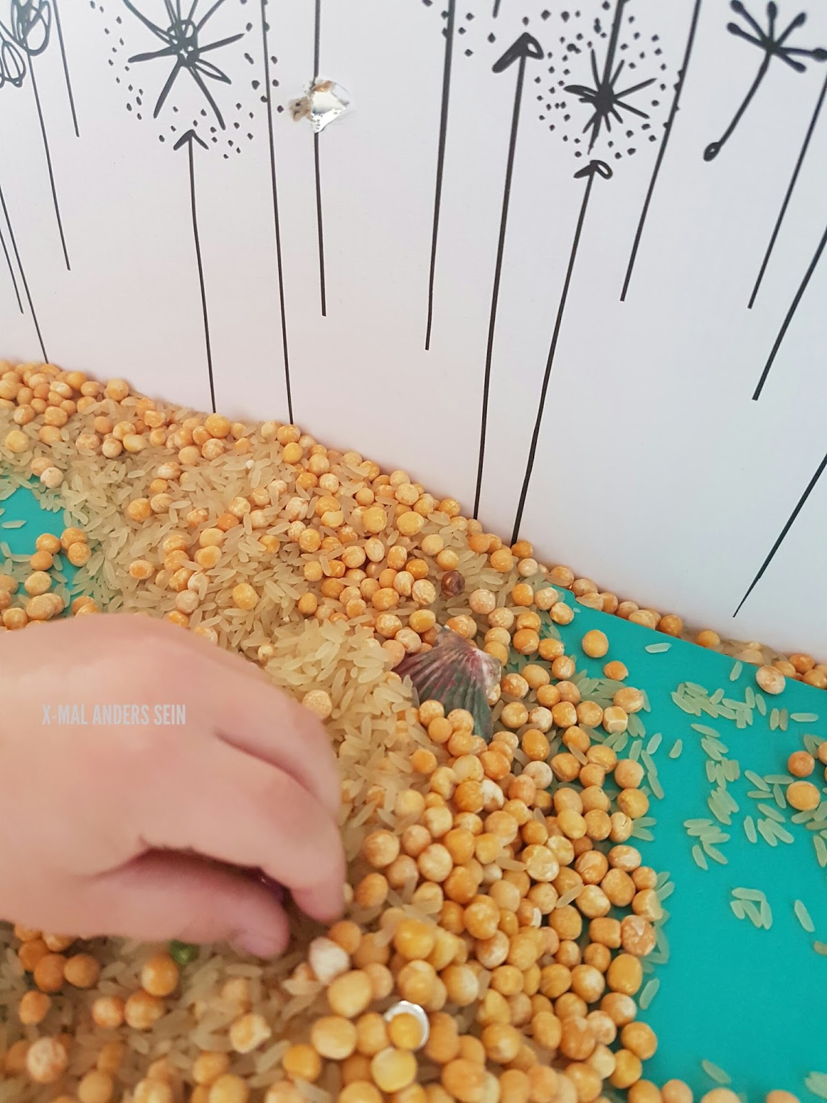 Die Schlechtwetterbeschäftigung bestand aus Erbsen rollen, Reis schütten und einer „Schatzsuche“, heißt, dass Kleinigkeiten gefunden werden mussten. Während ich die Kartonnutzung hier bei Instagram postete, passierte folgendes: